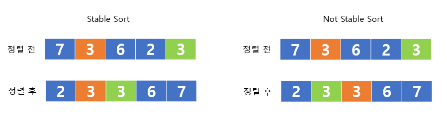 정렬 전과 다르게 주황색 3이 초록색 3보다 뒤에 있다.